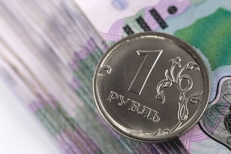 One Russian ruble metal coin and banknotes. Closeup macro view of Russian rubles