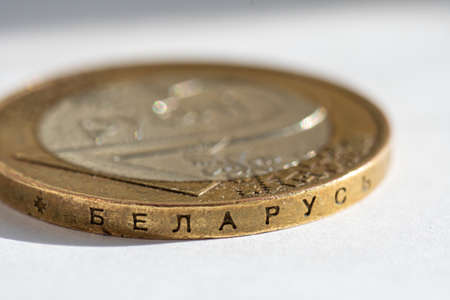 Belarusian money on a white background. Belarusian coin in macro in denominations of two rubles with an inscription on the side edge. Translation: Belarus