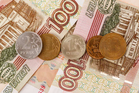 Russia money background. Heap of rubble banknotes. Currency top view. Money background with close up of russian Ruble A lot of Russian rubles. Iron money. Finance, business, investment concept.