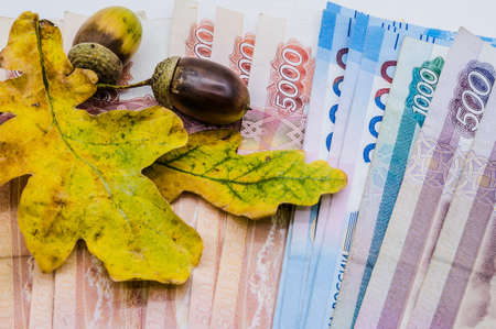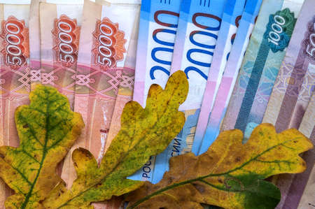 paper money and oak leaves, Russian money and autumn leaves, five thousand and two thousand rubles