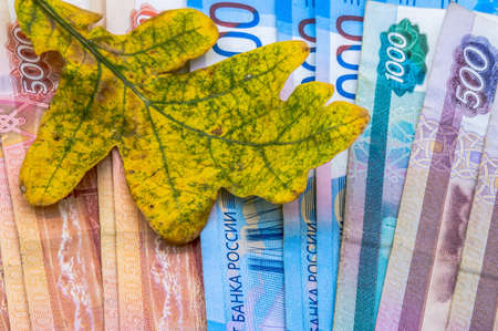 Yellow oak leaf on the background of money. Rubles and autumn leaf. Autumn promotions and sales.