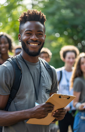 Male charity worker organizes industrial garbage collection in park, holding clipboard and lanyard card