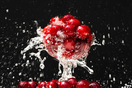 Ripe cherries in a glass. Juicy cherries in a glass with splashing water on a black background.