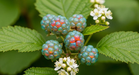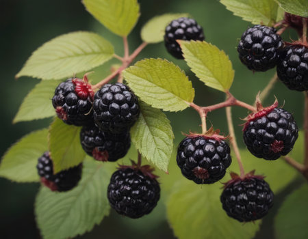 Close up of fresh blackberries nestled among lush green foliage in a vibrant garden setting