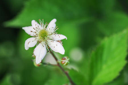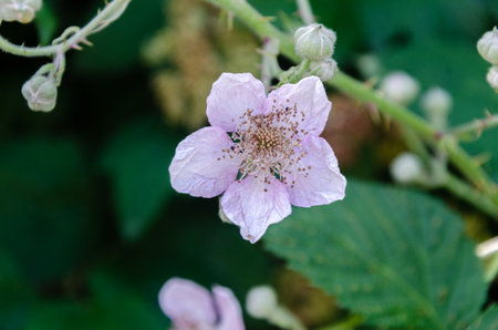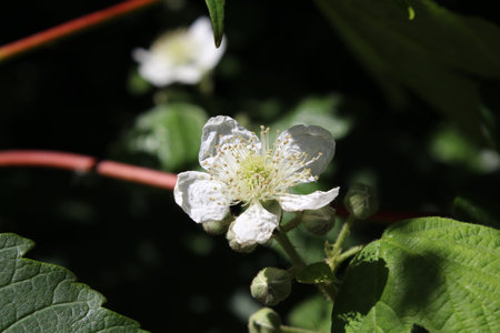 Rosacea flower of rubus ulmifolius illuminated by sunlight in the field