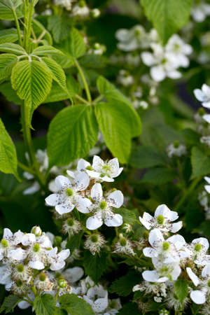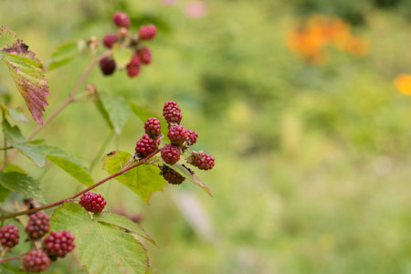 Selective focus and closeup view of shrub and fruit of Rubus ulmifolius subsp. sanctus, commonly called holy bramble, Blackberries (syn Rubus sanguineus and Rubus sanctus)