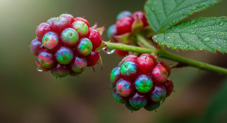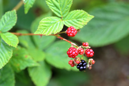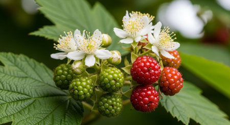 Close-up view of ripe and unripe blackberries developing on a blackberry bush, highlighting the vibrant transition from red to deep black as they reach full ripeness