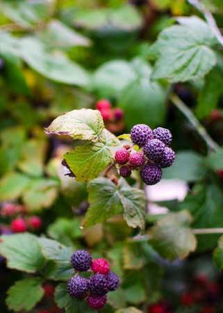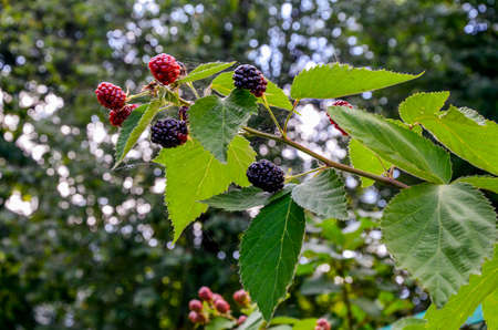 Ripe and unripe blackberries on the bush. Bunch of blackberries.