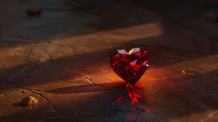 Stunning heart shaped ruby gemstone radiates brilliance under spotlight, casting vibrant reflections on textured surface. warm glow enhances its rich red hue, creating enchanting atmosphere