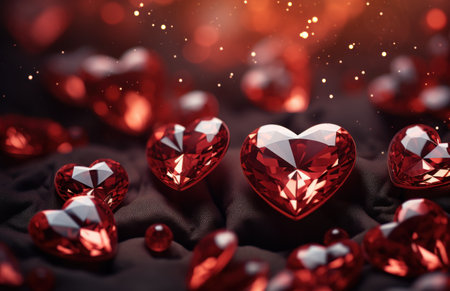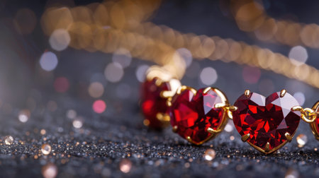 A stunning close-up of elegant heart-shaped red jewelry with sparkling gems, set against a dark backdrop, perfect for romantic occasions and celebrations.