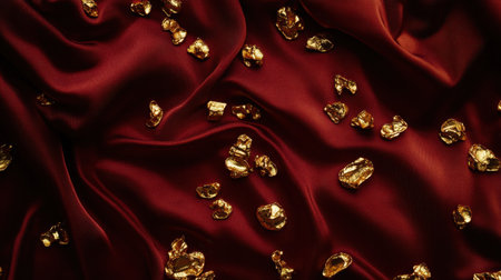 This stunning image features glimmering gold nuggets scattered across a rich red fabric, creating a luxurious and elegant composition perfect for artistic projects.