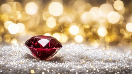 A vibrant ruby gemstone perched on a shimmering surface with delicate glitters, set against a warm golden bokeh background, embodying elegance and luxury.