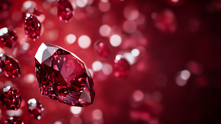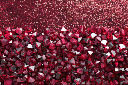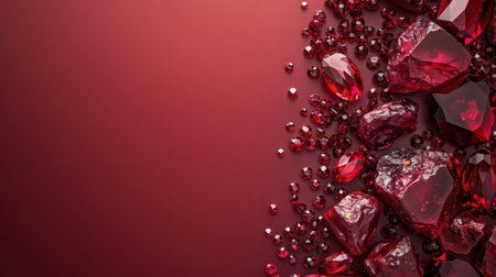 A stunning collection of sparkling red gemstones scattered elegantly across a reflective surface, creating a luxurious backdrop for various design projects.