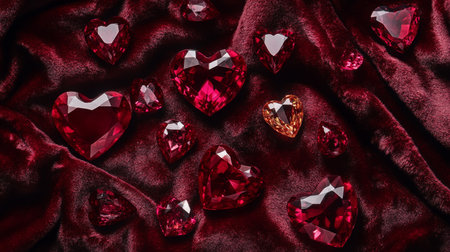 Vibrant red heart-shaped gemstones arranged on rich velvet fabric for artistic display