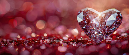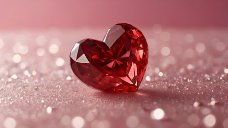 A heart-shaped red gemstone rests on a glittery red surface, reflecting light through its faceted edges. The blurred background features warm bokeh lights in yellow and orange tones, enhancing the romantic and luxurious feel. Ideal for themes of love, elegance, or celebration.