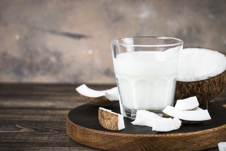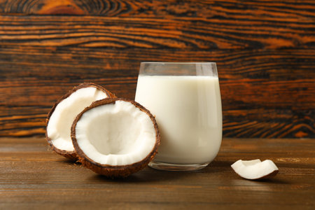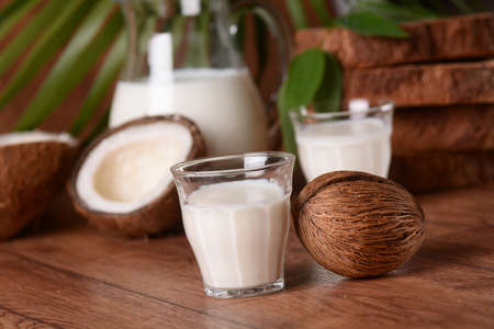 Fresh healthy coconut milk in a glass on wooden table background, Alternative type of vegan milks, Organic Healthy drink concept.
