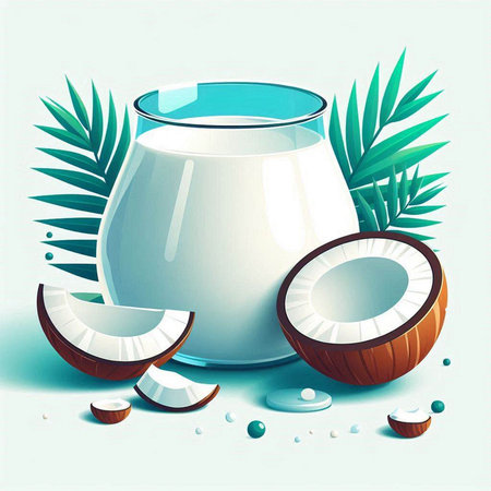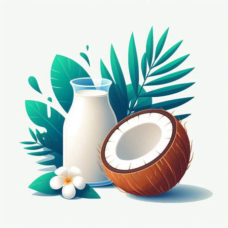 A refreshing still life featuring whole coconuts, a halved coconut, and a pitcher of creamy coconut milk, accented with palm leaves.