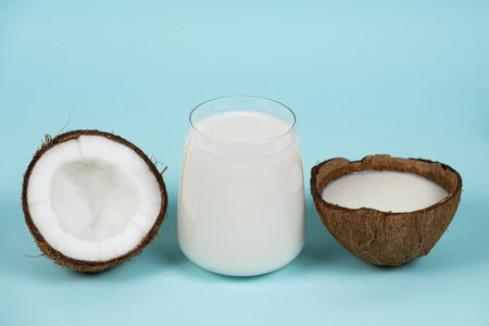 Healthy vegan coconut milk in a glass and coconut shell on a blue background