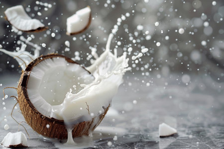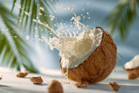 Exploding coconut: White milk splash from tropical fruit in a studio setting
