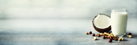 Organic vegan nut milk in glass with various assortment of nuts - coconut, almond, cashew, hazelnut on grey concrete background, copy space. Banner.