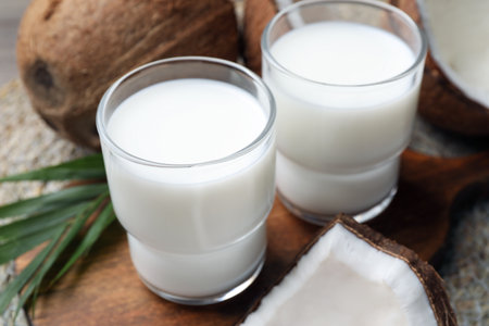 Glasses of delicious coconut milk, palm leaf and coconuts on table