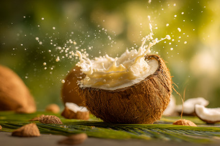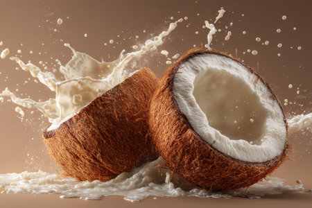 Close up of a halved coconut with milk splashes and cream pouring in stunning photorealistic style