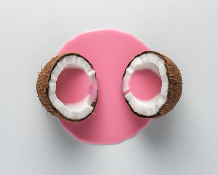 Creative layout made of coconut in half with pink milk pouring. Minimal food concept.