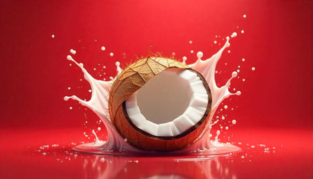 Coconut splash with creamy milk on a red background