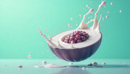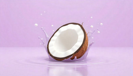Close up of a halved coconut with milk splashes and cream pouring in photorealistic style