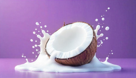 Coconut milk splashing inside shell, against a purple background
