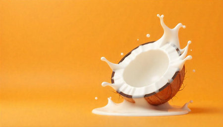 Coconut milk splash on bright orange background evokes freshness
