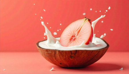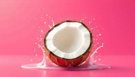 Coconut milk splash on pink background, a tropical indulgence