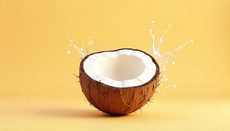 Half Coconut with Milk Splash on Yellow Background