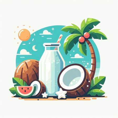 Coconut milk, watermelon and palm tree. Flat style vector illustration.