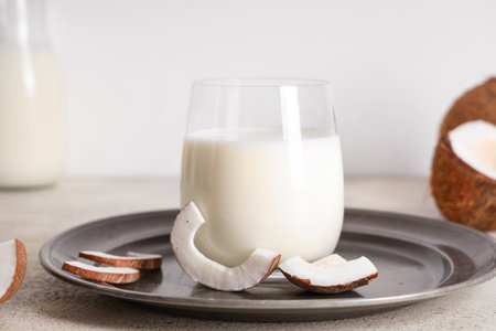 Coconut milk in glass, Vegan milk.