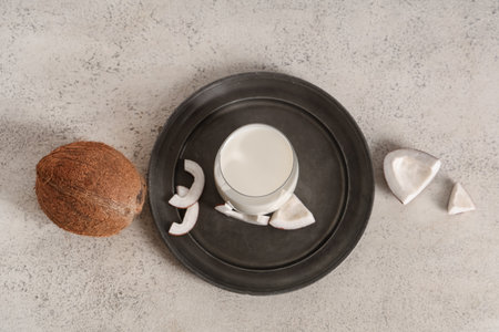 Dark plate and glass of tasty coconut milk on grunge background