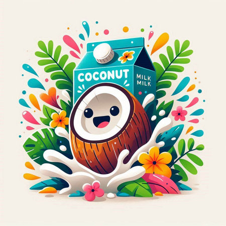 Coconut milk carton with cute cartoon character. Vector illustration.