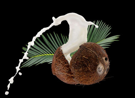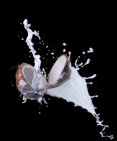 coconut halves with milk splash on a black background.