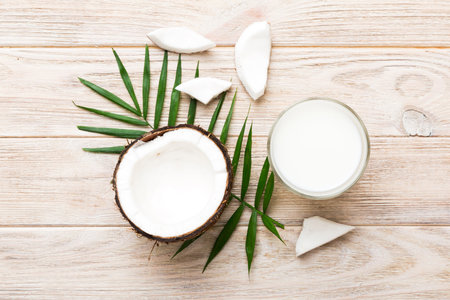 coconut products on white wooden table background. Dairy free milk substitute drink, Flat lay healthy eating.