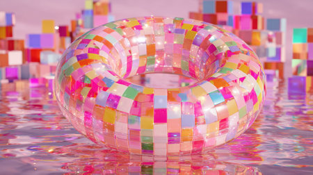 A vibrant donut shaped float is on the water. It is adorned with colorful mosaic tiles reflecting in the water and a nearby city of colorful translucent cubes.