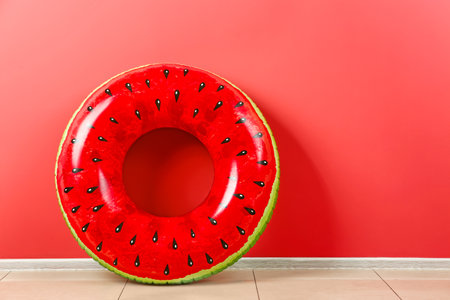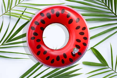Inflatable of watermelon ring with tropical palm leaves. Summer background concept