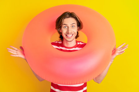 Photo of cheerful positive young guy dressed red t-shirt looking inside bloated circle isolated yellow color background