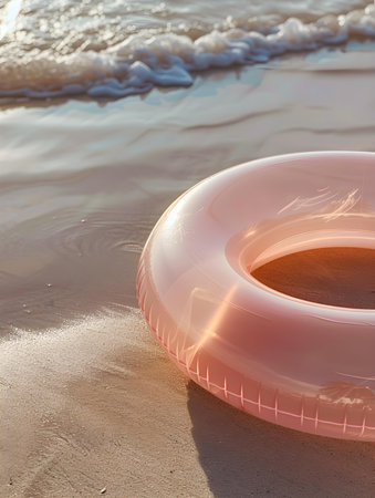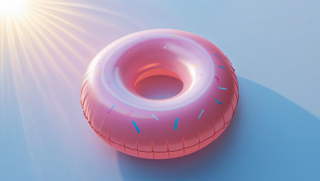 Pink inflatable ring shaped like a donut floating on a water surface with sunbeams. Ai generated image