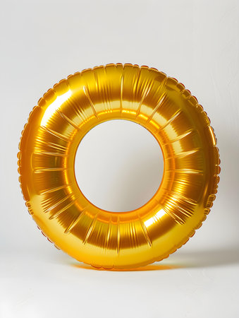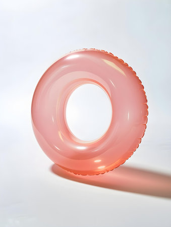 A pink inflatable ring with a white letter O on it. The ring is made of a shiny material and is placed on a pink background