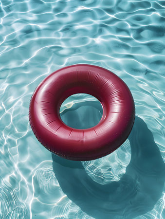 A bright red float ring floats calmly in a clear blue swimming pool, reflecting sunlight. It is a perfect day for swimming and relaxation on a warm summer afternoon.