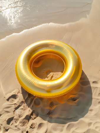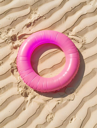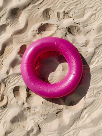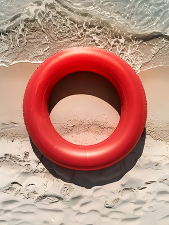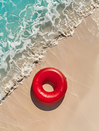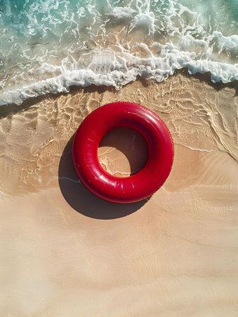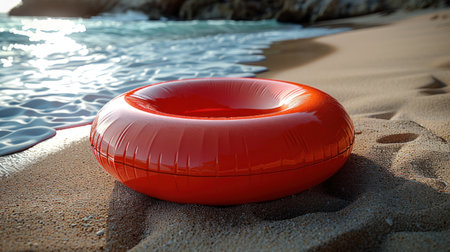A red inflatable ring sits on a sandy beach, ready for a day of fun in the sun.