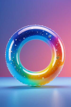 Inflatable Pink and Yellow Donut Ring Floating on Blue Background. AI. AI