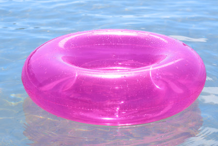 Close up of a magenta inflatable ring floating on pool water. Colorful Summer Wallpapers
