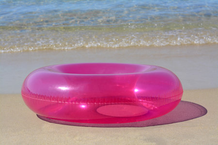Close Up of a fuchsia inflatable swimming ring on the beach