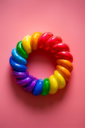 A vibrant arrangement of glossy pink and white donut shapes resting on a bright surface, perfect for themes of sweetness and celebration. Ideal for creative projects.